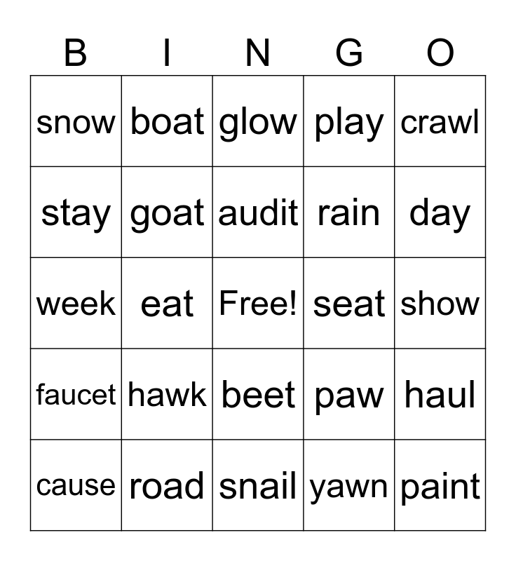 This bingo card has a free space and 24 words: hawk, road, audit, cause, crawl, snow, stay, boat, seat, beet, rain, week, paw, haul, goat, yawn, show, glow, day, eat, paint, faucet, play and snail.