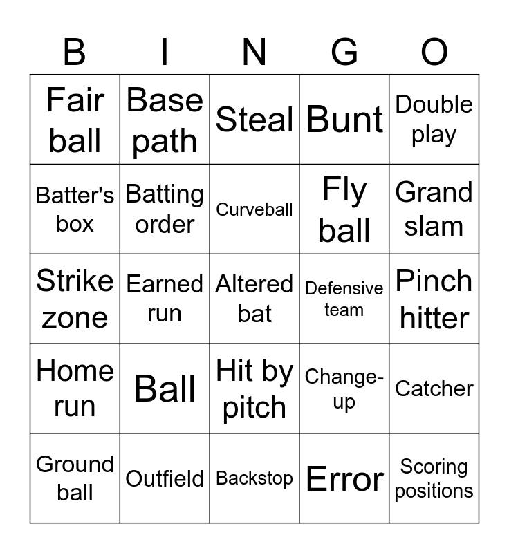 This bingo card has 46 words: Free!, Altered bat, Approved bat, Backstop, Ball, Base, Base path, Batted ball, Batter's box, Batting average, Batting order, Bunt, Catcher, Change-up, Coach's box, Count, Curveball, Defensive team, Designated hitter, Double play, Earned run, Error, Fair ball, Fly ball, Foul tip, Grand slam, Ground ball, Hit, Hit by pitch, Home run, Infield, Inning, Line drive, No-hitter, On-deck, Outfield, Pinch hitter, Pitcher, Rubber, Run, Scoring positions, Steal, Strike zone, Tag out, Triple play and Windmill.