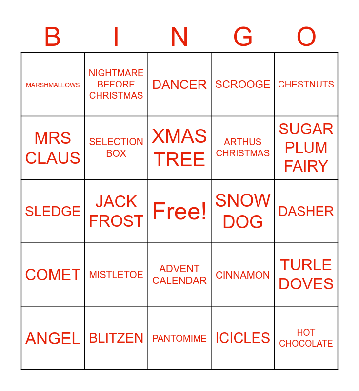 This bingo card has a free space and 69 words: BRUSSEL SPROUT, DASHER, TANGERINE, CANDLE, BLITZEN, CHRISTMAS MARKET, SCROOGE, COOKIES, CHESTNUTS, PAPER CHAINS, TURLE DOVES, NUTCRACKER, MARSHMALLOWS, DANCER, ELSA, JACK FROST, ADVENT CALENDAR, ARTHUS CHRISTMAS, NOEL, COMET, SNOW DOG, CINNAMON, SUGAR PLUM FAIRY, CANDY CANES, CHIMNEY, CUPID, RIBBON, BOXING DAY, ICICLES, POLAR BEAR, NIGHTMARE BEFORE CHRISTMAS, CHRISTMAS LIGHTS, JINGLE BELLS, BAUBLES, WREATHS, ICE SKATING, HOLLY, PRESENTS, MRS CLAUS, SNOWMAN, MISTLETOE, HOT CHOCOLATE, SNOWFLAKE, GINGERBREAD HOUSE, NORTH POLE, ANGEL, CHRISTMAS EVE, WRAPPING PAPER, YULE LOG, SELECTION BOX, XMAS TREE, SLEIGH, FELIZ NAVIDAD, PANTOMIME, TURKEY, GRINCH, CRACKER, MINCE PIES, HOME ALONE, SLEDGE, STAR, SANTA CLAUS, EGG NOG, CAROL SINGERS, RUDOLPH, POLAR EXPRESS ELF, STOCKINGS, JUMPERS and XMAS PUD.