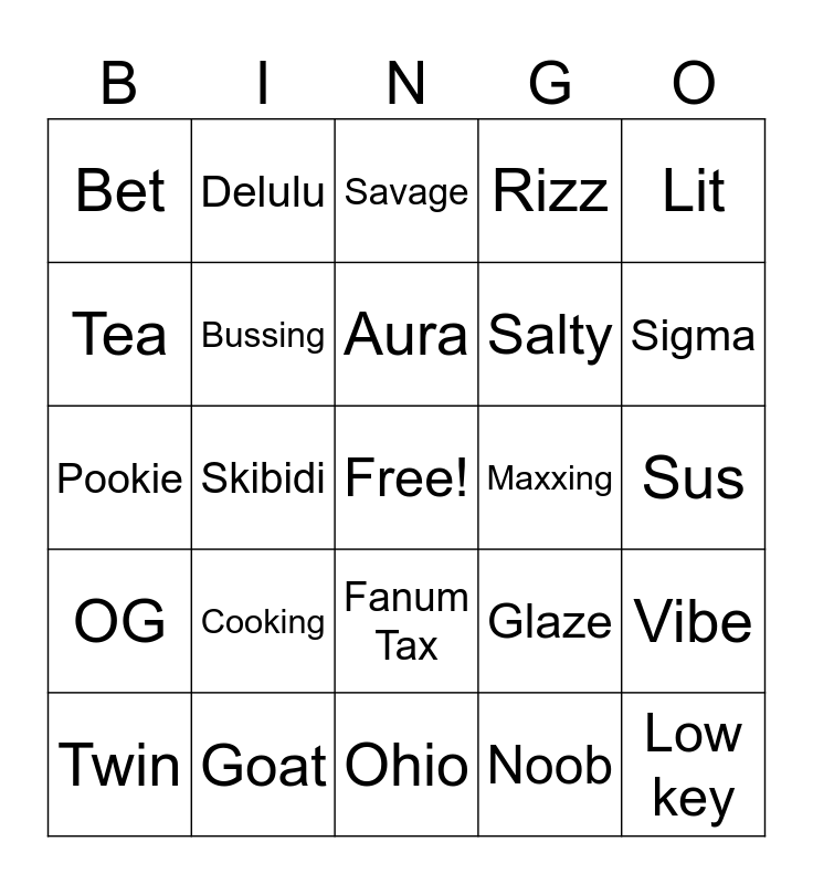 This bingo card has a free space and 25 words: Cooking, Ohio, Aura, Twin, Lit, Bet, Tea, Delulu, Maxxing, Fanum Tax, Salty, Pookie, Glaze, Vibe, Bussing, Yapping, Sus, Savage, Sigma, Skibidi, Low key, Goat, OG, Rizz and Noob.
