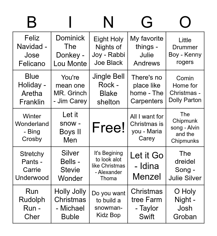This bingo card has a free space and 24 words: Silver Bells - Stevie Wonder, Holly Jolly Christmas - Michael Buble, Jingle Bell Rock - Blake shelton, Run Rudolph Run - Cher, Little Drummer Boy - Kenny rogers, Feliz Navidad - Jose Felicano, Blue Holiday - Aretha Franklin, Dominick The Donkey - Lou Monte, All I want for Christmas is you - Maria Carey, It's Begining to look alot like Christmas - Alexander Thoma, There's no place like home - The Carpenters, Winter Wonderland - Bing Crosby, Let it Go - Idina Menzel, The dreidel Song - Julie Silver, You're mean one MR. Grinch - Jim Carey, Christmas tree Farm - Taylor Swift, The Chipmunk song - Alvin and the Chipmunks, Eight Holy Nights of Joy - Rabbi Joe Black, Comin Home for Christmas - Dolly Parton, Let it snow - Boys II Men, O Holy Night -Josh Groban, Stretchy Pants - Carrie Underwood, My favorite things - Julie Andrews and Do you want to build a snowman- Kidz Bop.