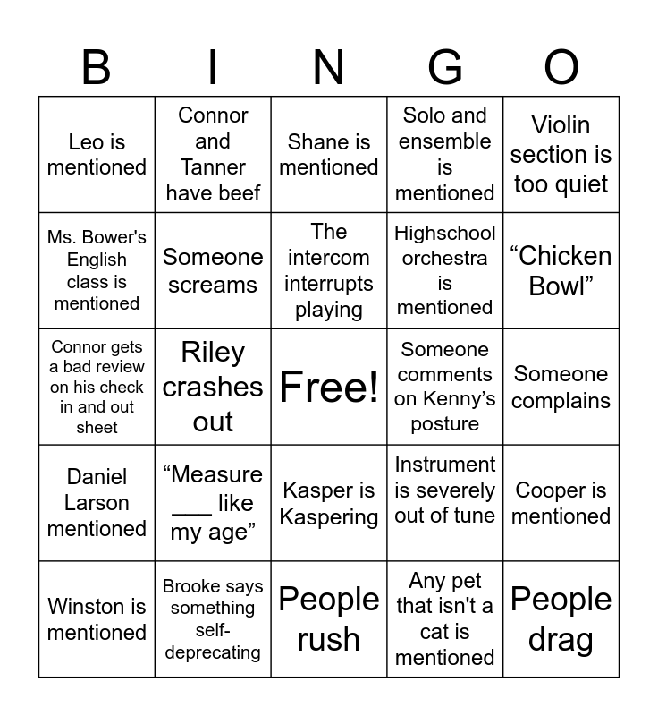 This bingo card has a free space and 33 words: Connor does something dumb, ML. Daniels is mentioned, Riley crashes out, Rory is mentioned, Daniel Larson mentioned, Someone screams, Violin section is too quiet, Winston is mentioned, Connor and Tanner have beef, Amara talks about personal life, The intercom interrupts playing, Shane is mentioned, Someone drops an instrument, Someone says something out of pocket, Someone comments on Kenny’s posture, “Chicken Bowl”, Brooke says something self-deprecating, Connor gets a bad review on his check in and out sheet, “Measure ___ like my age”, Instrument is severely out of tune, Kasper is Kaspering, “Hot Guy Friday”, Leo is mentioned, Someone complains, People rush, People drag, Solo and ensemble is mentioned, Highschool orchestra is mentioned, Ms. Bower's English class is mentioned, Cooper is mentioned, Connor does something weird with an instrument, Any pet that isn't a cat is mentioned and Ms. Bowers has Java coffee on her desk.