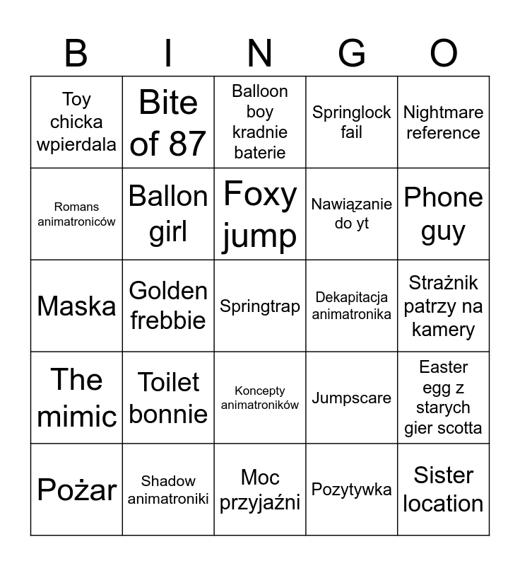 This bingo card has a free space and 24 words: Toilet bonnie, Shadow animatroniki, Foxy jump, Pożar, Nightmare reference, Toy chicka wpierdala, Romans animatroniców, Bite of 87, Dekapitacja animatronika, Koncepty animatroników, Nawiązanie do yt, Maska, Jumpscare, Easter egg z starych gier scotta, Ballon girl, Pozytywka, Strażnik patrzy na kamery, Balloon boy kradnie baterie, Phone guy, Golden frebbie, Sister location, The mimic, Springlock fail and Moc przyjaźni.