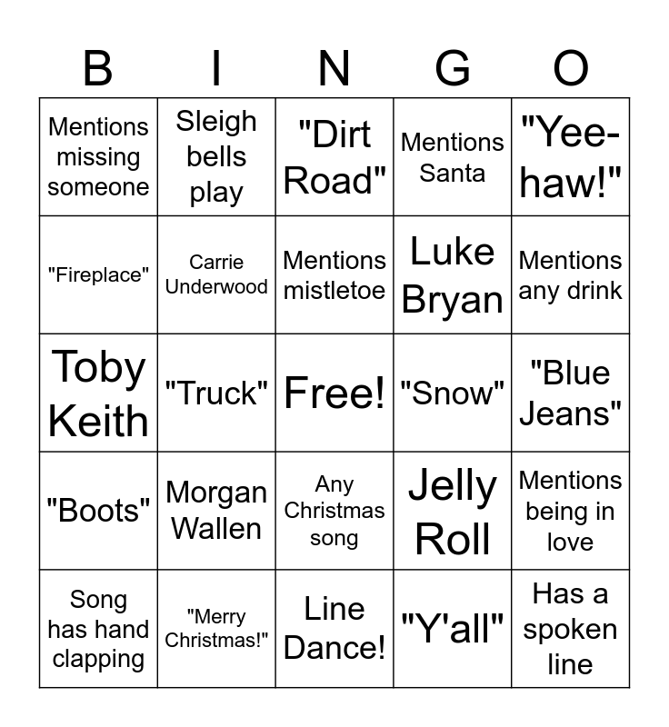 This bingo card has a free space and 24 words: Morgan Wallen, "Merry Christmas!", Mentions mistletoe, Song has hand clapping, "Yee-haw!", Mentions missing someone, "Fireplace", Sleigh bells play, "Snow", Any Christmas song, Luke Bryan, Toby Keith, Jelly Roll, Mentions being in love, Carrie Underwood, "Y'all", "Blue Jeans", "Dirt Road", Mentions any drink, "Truck", Has a spoken line, "Boots", Mentions Santa and Line Dance!.