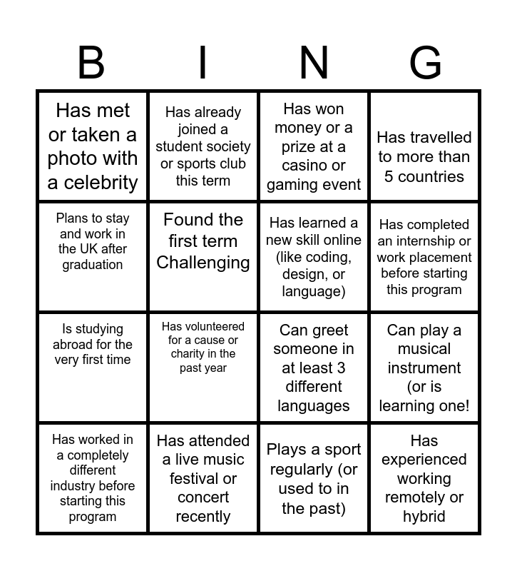 This bingo card has 16 words: Has attended a live music festival or concert recently, Can play a musical instrument (or is learning one!, Has won money or a prize at a casino or gaming event, Has met or taken a photo with a celebrity, Is studying abroad for the very first time, Has already joined a student society or sports club this term, Can greet someone in at least 3 different languages, Plays a sport regularly (or used to in the past), Plans to stay and work in the UK after graduation, Found the first term Challenging, Has worked in a completely different industry before starting this program, Has travelled to more than 5 countries, Has volunteered for a cause or charity in the past year, Has completed an internship or work placement before starting this program, Has learned a new skill online (like coding, design, or language) and Has experienced working remotely or hybrid.