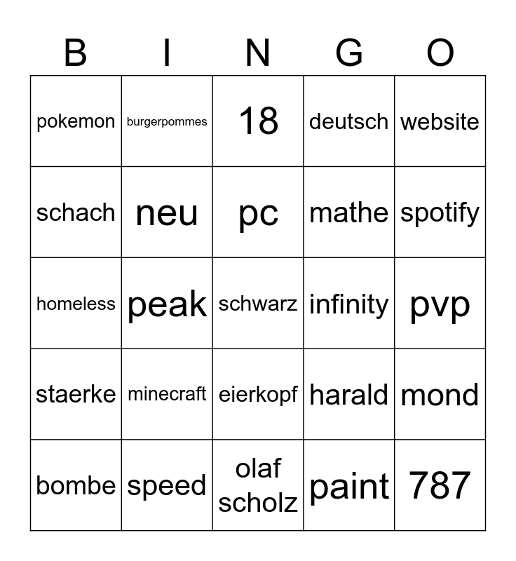 This bingo card has 25 words: minecraft, olaf scholz, pc, bombe, website, pokemon, schach, burgerpommes, infinity, eierkopf, mathe, homeless, harald, mond, neu, 787, pvp, 18, spotify, peak, schwarz, speed, staerke, deutsch and paint.