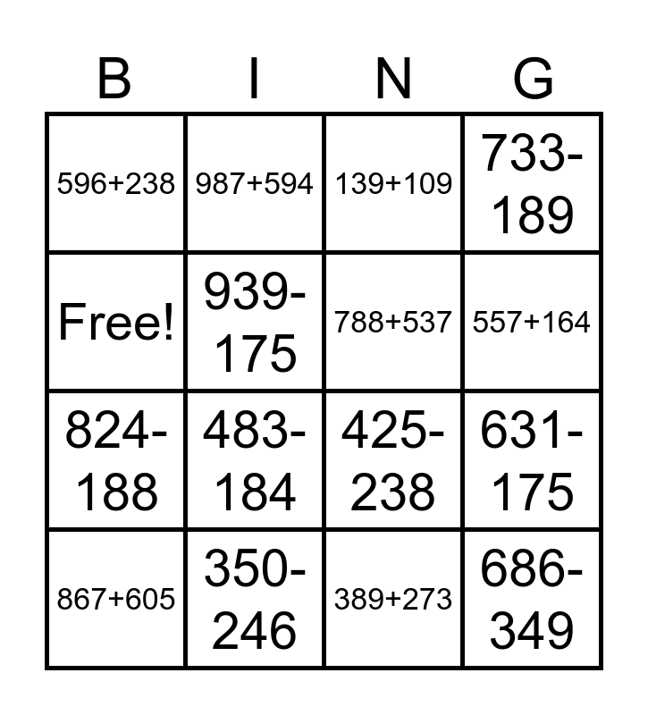 This bingo card has 16 words: 350-246, 631-175, 139+109, 596+238, 824-188, 987+594, 425-238, 389+273, Free!, 939-175, 867+605, 733-189, 483-184, 557+164, 788+537 and 686-349.