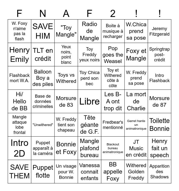 This bingo card has a free space and 48 words: Blackout bureau animatronique, Foxy et Mangle, Vanessa connait enfants, Base de données criminelles, Toys vs Withered, Morsure de 87, SAVE HIM, Puppet flotte, W.Chica prend sa pose, Tête géante de G.F., Jeremy Fitzgerald, Radio de Mangle, W. Freddy prend sa pose, Toy et Withered côte à côte, Intro 2D, La mort de Charlie, Henry Emily, Springtrap post-crédit, JT Music en crédit, Boite à musique à recharger, Pop goes the Weasel, Morsure de 83, W. Foxy n'aime pas la flash, TLT en crédit, Henry fait un speech, Yeux noirs, point blanc, Intro Flashback, SAVE THEM, Toy Chica perd son bec, Balloon Boy a des piles, Withered Golden Freddy, Les B-A ont trop dit, Toilette Bonnie, Puppet apparaît à la caméra, Hi/ Hello de BB, Fredbear's mentionné, Garret hante un animatronique, Flashback mort W.A., W. Freddy tient son chapeau, Bonnie et Foxy, Mangle attaque lobe frontal, Apparition des Shadows, "Toy Mangle", Un visage pour W. Bonnie, Toy Freddy yeux noirs, Mangle plafond bureau, "Unwithered" and BB appelle Foxy.
