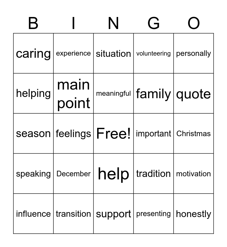 This bingo card has a free space and 60 words: slide, transition, partner, speaking, presenting, explain, main point, takeaway, family, giving, volunteering, kindness, helping, generosity, spirit, caring, honestly, personally, relatable, meaningful, important, situation, influence, motivation, choice, perspective, value, understanding, quote, meaning, audience, message, connection, example, experience, real, life, feelings, reflection, season, holiday, December, Christmas, Thanksgiving, tradition, giving, kindness, community, responsibility, help, support, gratitude, inspire, change, impact, positive, challenge, respect, action and empathy.