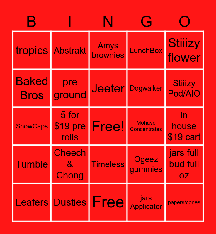 This bingo card has a free space and 24 words: Cheech & Chong, Dusties, Jeeter, Leafers, Stiiizy flower, tropics, Baked Bros, Abstrakt, Mohave Concentrates, Timeless, Dogwalker, SnowCaps, Ogeez gummies, jars full bud full oz, pre ground, jars Applicator, in house $19 cart, Amys brownies, Stiiizy Pod/AIO, 5 for $19 pre rolls, papers/cones, Tumble, LunchBox and Free.