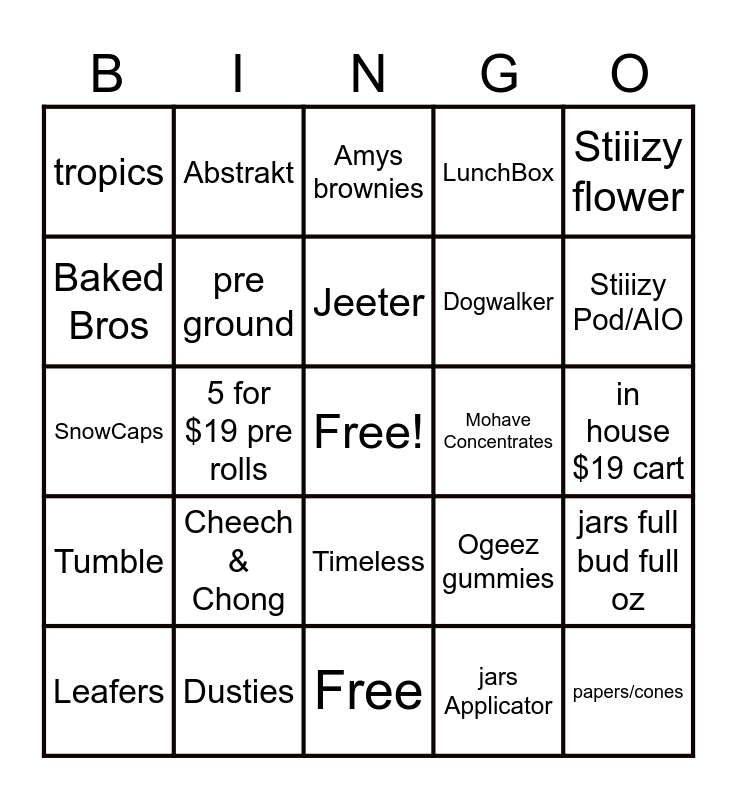 This bingo card has a free space and 24 words: Cheech & Chong, Dusties, Jeeter, Leafers, Stiiizy flower, tropics, Baked Bros, Abstrakt, Mohave Concentrates, Timeless, Dogwalker, SnowCaps, Ogeez gummies, jars full bud full oz, pre ground, jars Applicator, in house $19 cart, Amys brownies, Stiiizy Pod/AIO, 5 for $19 pre rolls, papers/cones, Tumble, LunchBox and Free.