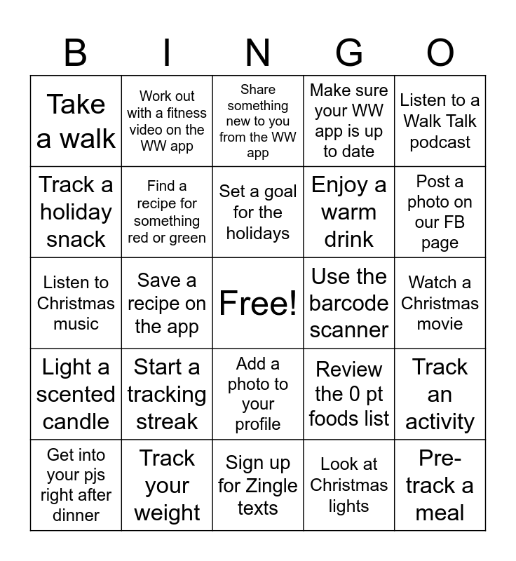 This bingo card has a free space and 24 words: Start a tracking streak, Track your weight, Set a goal for the holidays, Get into your pjs right after dinner, Listen to a Walk Talk podcast, Take a walk, Track a holiday snack, Work out with a fitness video on the WW app, Use the barcode scanner, Add a photo to your profile, Enjoy a warm drink, Listen to Christmas music, Review the 0 pt foods list, Track an activity, Find a recipe for something red or green, Look at Christmas lights, Watch a Christmas movie, Share something new to you from the WW app, Post a photo on our FB page, Save a recipe on the app, Pre-track a meal, Light a scented candle, Make sure your WW app is up to date and Sign up for Zingle texts.