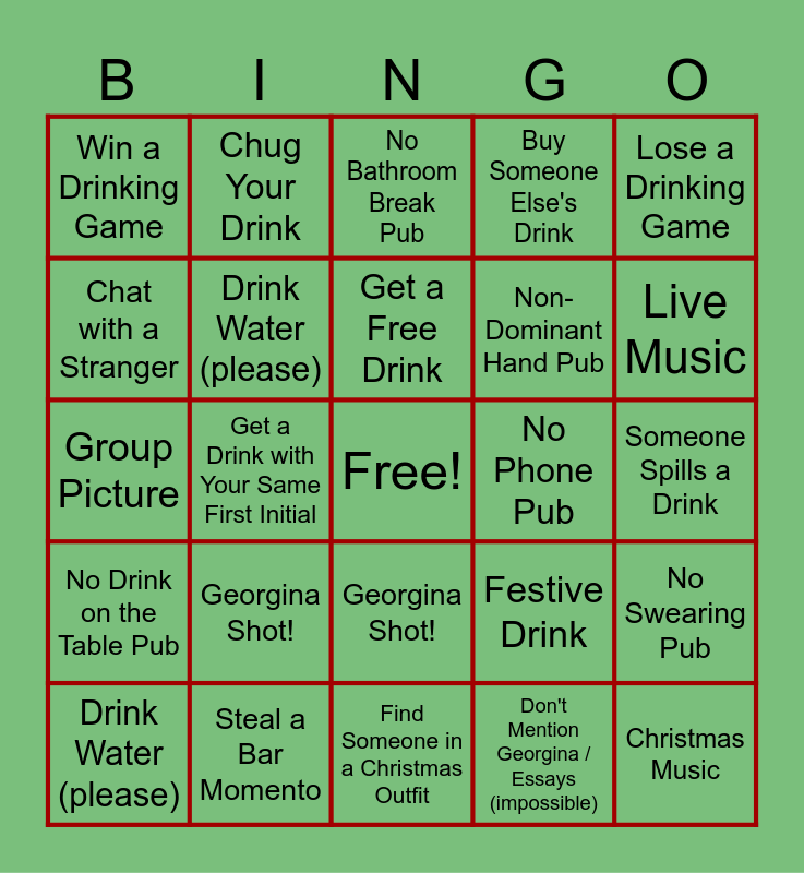 This bingo card has a free space and 24 words: Georgina Shot!, Steal a Bar Momento, Get a Free Drink, Drink Water (please), Lose a Drinking Game, Win a Drinking Game, Chat with a Stranger, Chug Your Drink, No Phone Pub, Georgina Shot!, Non-Dominant Hand Pub, Group Picture, Festive Drink, No Swearing Pub, Drink Water (please), Don't Mention Georgina / Essays (impossible), Someone Spills a Drink, No Bathroom Break Pub, Live Music, Get a Drink with Your Same First Initial, Christmas Music, No Drink on the Table Pub, Buy Someone Else's Drink and Find Someone in a Christmas Outfit.