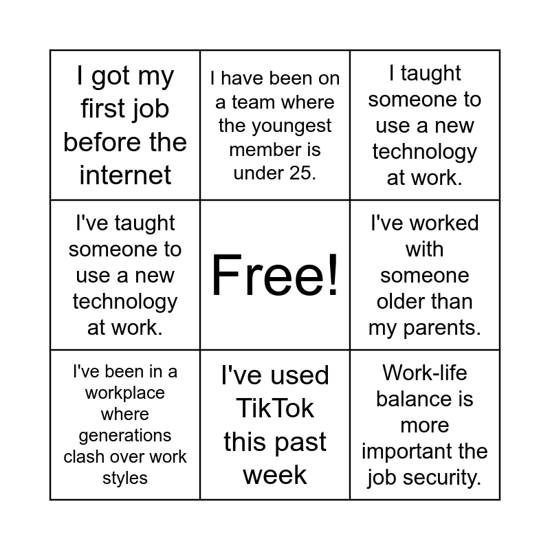This bingo card has a free space and 15 words: I've been on a team where the youngest member is about 25., I've worked with someone older than my parents., I taught someone to use a new technology at work., I got my first job before the internet, I've used TikTok this past week, Work-life balance is more important the job security., I've mentored someone from a different generation., I felt misunderstood due to my age at work, I've worked with someone older than my parents., I learned to type on a typewriter., I posted a video on social media within the last week., I've taught someone to use a new technology at work., I've been in a workplace where generations clash over work styles, I have been on a team where the youngest member is under 25. and I have had to use carbon paper to get copies..