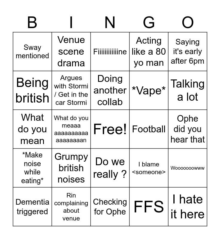 This bingo card has a free space and 24 words: Grumpy british noises, Rin complaining about venue, Doing another collab, Dementia triggered, Saying it's early after 6pm, Sway mentioned, Being british, Venue scene drama, Football, Do we really ?, *Vape*, What do you mean, I blame <someone>, Wooooooowww, Argues with Stormi / Get in the car Stormi, FFS, Ophe did you hear that, Fiiiiiiiiiiiine, Talking a lot, What do you meaaa aaaaaaaaaa aaaaaaaan, I hate it here, *Make noise while eating*, Acting like a 80 yo man and Checking for Ophe.