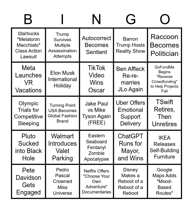 This bingo card has a free space and 24 words: Pete Davidson Gets Engaged, Walmart Introduces Valet Parking, TikTok Video Wins Oscar, Disney Makes a Reboot of a Reboot of a Reboot, Raccoon Becomes Politician, Starbucks "Melatonin Macchiato" Class Action Lawsuit, Trump Survives Multiple Assassination Attempts, Autocorrect Becomes Sentient, Uber Offers Emotional Support Delivery, TSwift Retires, Then Unretires, Olympic Trials for Competitive Sleeping, Elon Musk International Holiday, ChatGPT Runs for Mayor, and Wins, IKEA Releases Self-Building Furniture, Meta Launches VR Vacations, Pedro Pascal Crowned Miss Universe, Netflix Offers "Choose Your Own Adventure" Documentaries, Barron Trump Hosts Reality Show, GoFundMe Begins "Reverse Crowdfunding" to Help Projects Fail, Pluto Sucked into Black Hole, Turning Point USA Becomes Global Fashion Brand, Eastern Seaboard Fentanyl Zombie Apocalypse, Ben Affleck Re-re-marries JLo Again and Google Maps Adds "Mood- Based Routes".