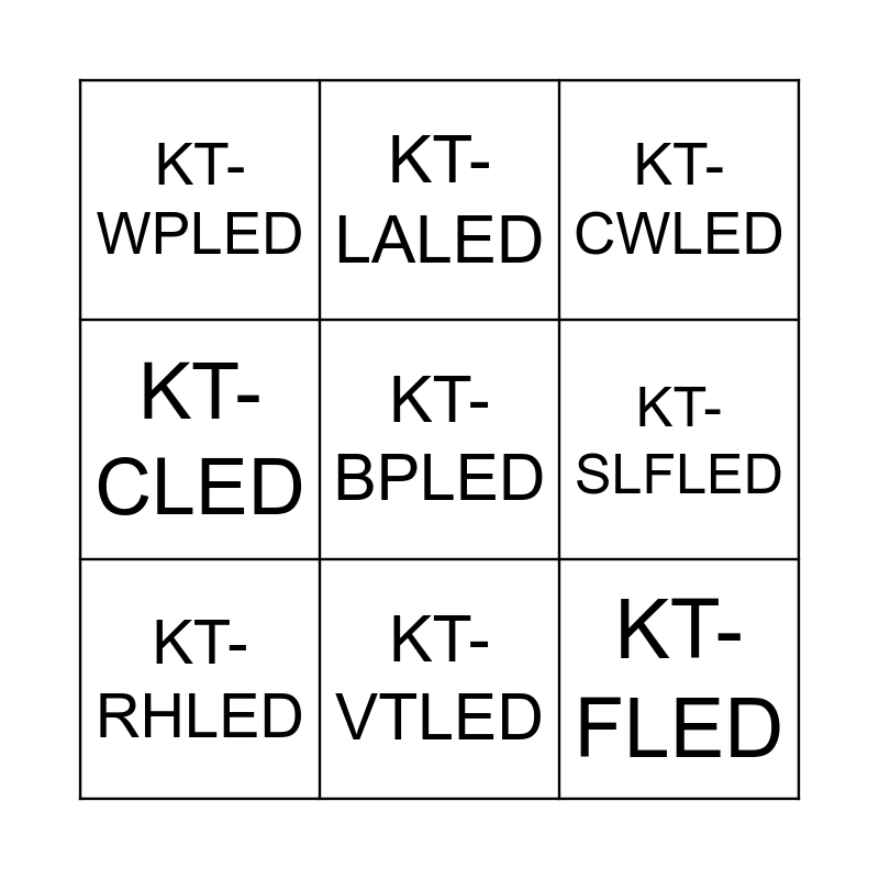 This bingo card has 32 words: KT-LED, KT-RDLED, KT-WDLED, KT-SMLED, KT-HBLED, KT-RHLED, KT-BPLED, KT-CBLED, KT-LALED, KT-MSLED, KT-VTLED, KT-CWLED, KT-WLED, KT-SWLED, KT-RKIT, KT-TFLED, KT-DDSLED, KT-DDHBLED, KT-DDPTLED, KT-DDWLED, KT-SCLED, KT-EX, KT-EC, KT-EM, KT-ALED, KT-CLED, KT-FLED, KT-SLFLED, KT-WPLED, KT-CYLED, KT-MPLED and KT-BLED.