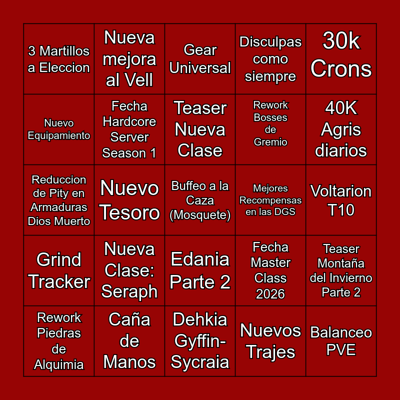 This bingo card has 25 words: Nueva Clase: Seraph, Dehkia Gyffin- Sycraia, Teaser Nueva Clase, Rework Piedras de Alquimia, 30k Crons, 3 Martillos a Eleccion, Nuevo Equipamiento, Nueva mejora al Vell, Mejores Recompensas en las DGS, Edania Parte 2, Rework Bosses de Gremio, Reduccion de Pity en Armaduras Dios Muerto, Fecha Master Class 2026, Teaser Montaña del Invierno Parte 2, Fecha Hardcore Server Season 1, Balanceo PVE, Voltarion T10, Gear Universal, 40K Agris diarios, Nuevo Tesoro, Buffeo a la Caza (Mosquete), Caña de Manos, Grind Tracker, Disculpas como siempre and Nuevos Trajes.