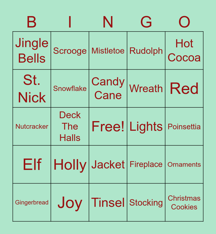 This bingo card has a free space and 58 words: Merry, Joy, Santa Claus, Elf, Stocking, Garland, Snowflake, Christmas Tree, Wreath, North Pole, Rudolph, Family, Sleigh, Noel, Snow Angel, Jingle Bells, Christmas Cookies, Hot Cocoa, Eggnog, Candy Cane, Lights, Mistletoe, Gingerbread, Ornaments, December, Poinsettia, Presents, Ribbon, Red, Green, Icicle, Prancer, Dasher, Comet, Cupid, Winter, Silent Night, Deck The Halls, Nutcracker, Frosty, Holly, Bow, Fireplace, Greetings, Pinecone, Star, Mittens, Jacket, Tinsel, Cheer, Festive, Spirit, Chimney, Grinch, Scrooge, Jack Frost, St. Nick and Holiday.