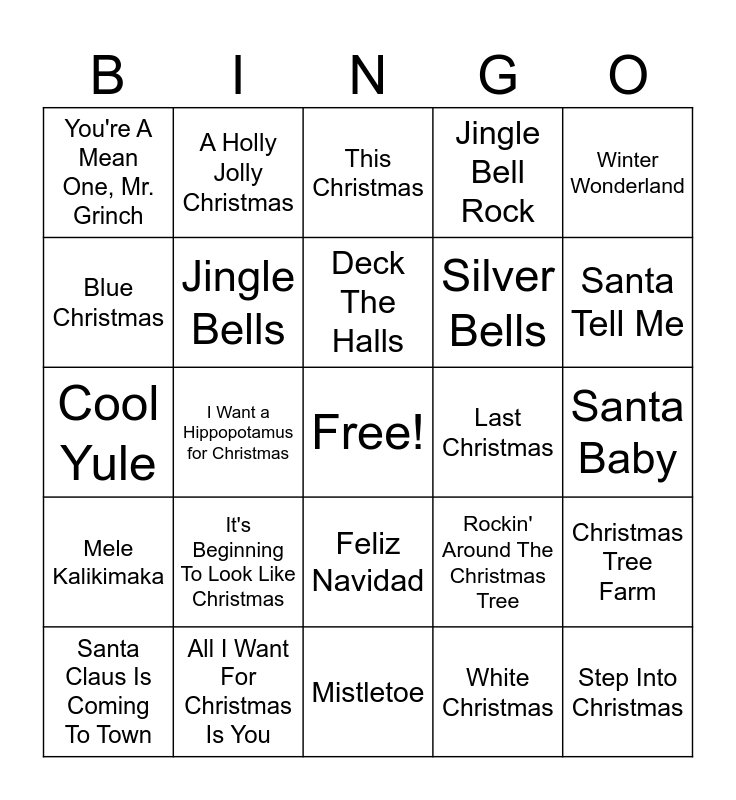 This bingo card has a free space and 32 words: White Christmas, Sleigh Ride, I Want a Hippopotamus for Christmas, Run Rudolph Run, Mele Kalikimaka, Jingle Bells, Winter Wonderland, Christmas Tree Farm, A Holly Jolly Christmas, Wonderful Christmastime, Deck The Halls, This Christmas, Baby, It's Cold Outside, It's the Most Wonderful Time of the Year, Last Christmas, Let It Snow!, Santa Claus Is Coming To Town, Cool Yule, Feliz Navidad, It's Beginning To Look Like Christmas, Rockin' Around The Christmas Tree, Christmas (Baby Please Come Home), Santa Baby, All I Want For Christmas Is You, Step Into Christmas, Jingle Bell Rock, Silver Bells, Blue Christmas, You're A Mean One, Mr. Grinch, Mistletoe, Frosty The Snowman and Santa Tell Me.