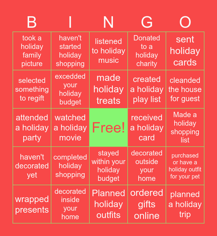 This bingo card has a free space and 24 words: completed holiday shopping, decorated inside your home, made holiday treats, wrapped presents, sent holiday cards, took a holiday family picture, selected something to regift, haven't started holiday shopping, received a holiday card, stayed within your holiday budget, created a holiday play list, attended a holiday party, decorated outside your home, purchased or have a holiday outfit for your pet, excedded your holiday budget, ordered gifts online, Made a holiday shopping list, listened to holiday music, cleanded the house for guest, watched a holiday movie, planned a holiday trip, haven't decorated yet, Donated to a holiday charity and Planned holiday outfits.