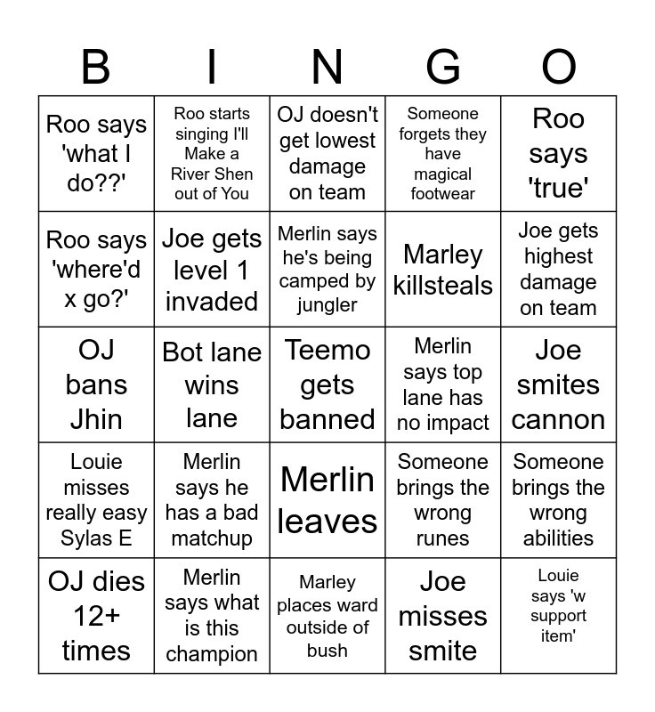 This bingo card has a free space and 24 words: Merlin says he has a bad matchup, Merlin says what is this champion, Merlin says he's being camped by jungler, OJ dies 12+ times, Roo says 'true', Roo says 'what I do??', Roo says 'where'd x go?', Roo starts singing I'll Make a River Shen out of You, Merlin says top lane has no impact, Merlin leaves, Marley killsteals, OJ bans Jhin, Someone brings the wrong runes, Someone brings the wrong abilities, Joe gets level 1 invaded, Joe misses smite, Joe smites cannon, OJ doesn't get lowest damage on team, Joe gets highest damage on team, Bot lane wins lane, Louie says 'w support item', Louie misses really easy Sylas E, Someone forgets they have magical footwear and Marley places ward outside of bush.