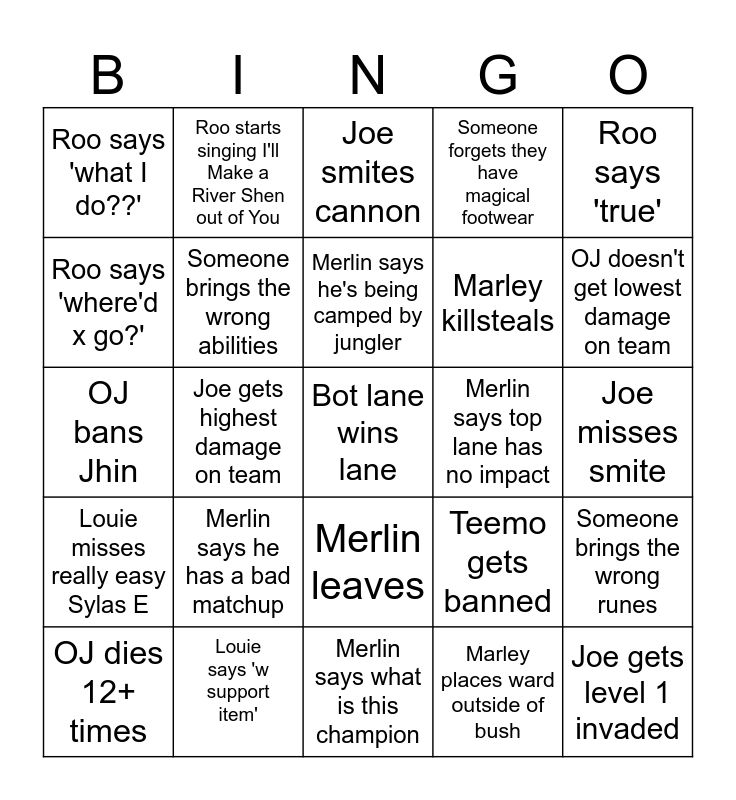 This bingo card has 25 words: Merlin says he has a bad matchup, Merlin says what is this champion, Merlin says he's being camped by jungler, OJ dies 12+ times, Roo says 'true', Roo says 'what I do??', Roo says 'where'd x go?', Roo starts singing I'll Make a River Shen out of You, Merlin says top lane has no impact, Merlin leaves, Marley killsteals, OJ bans Jhin, Teemo gets banned, Someone brings the wrong runes, Someone brings the wrong abilities, Joe gets level 1 invaded, Joe misses smite, Joe smites cannon, OJ doesn't get lowest damage on team, Joe gets highest damage on team, Bot lane wins lane, Louie says 'w support item', Louie misses really easy Sylas E, Someone forgets they have magical footwear and Marley places ward outside of bush.