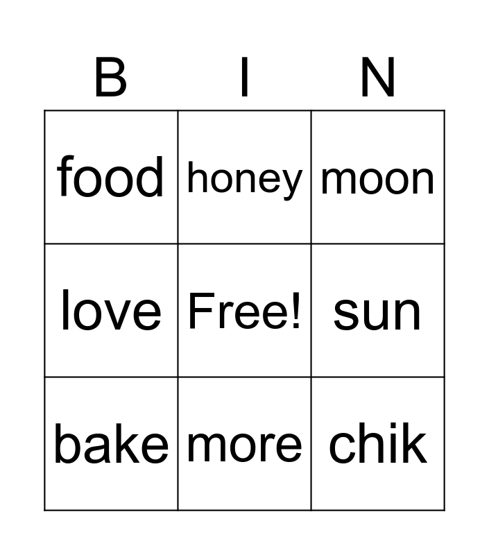 This bingo card has a free space and 8 words: sun, moon, honey, bake, food, chik, love and more.