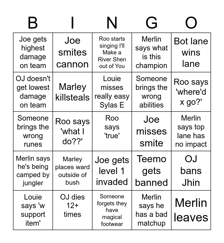 This bingo card has 25 words: Marley places ward outside of bush, Someone forgets they have magical footwear, Louie misses really easy Sylas E, Louie says 'w support item', Bot lane wins lane, Joe gets highest damage on team, OJ doesn't get lowest damage on team, Joe smites cannon, Joe misses smite, Joe gets level 1 invaded, Someone brings the wrong abilities, Someone brings the wrong runes, Teemo gets banned, OJ bans Jhin, Marley killsteals, Merlin leaves, Merlin says top lane has no impact, Roo starts singing I'll Make a River Shen out of You, Roo says 'where'd x go?', Roo says 'what I do??', Roo says 'true', OJ dies 12+ times, Merlin says he's being camped by jungler, Merlin says what is this champion and Merlin says he has a bad matchup.