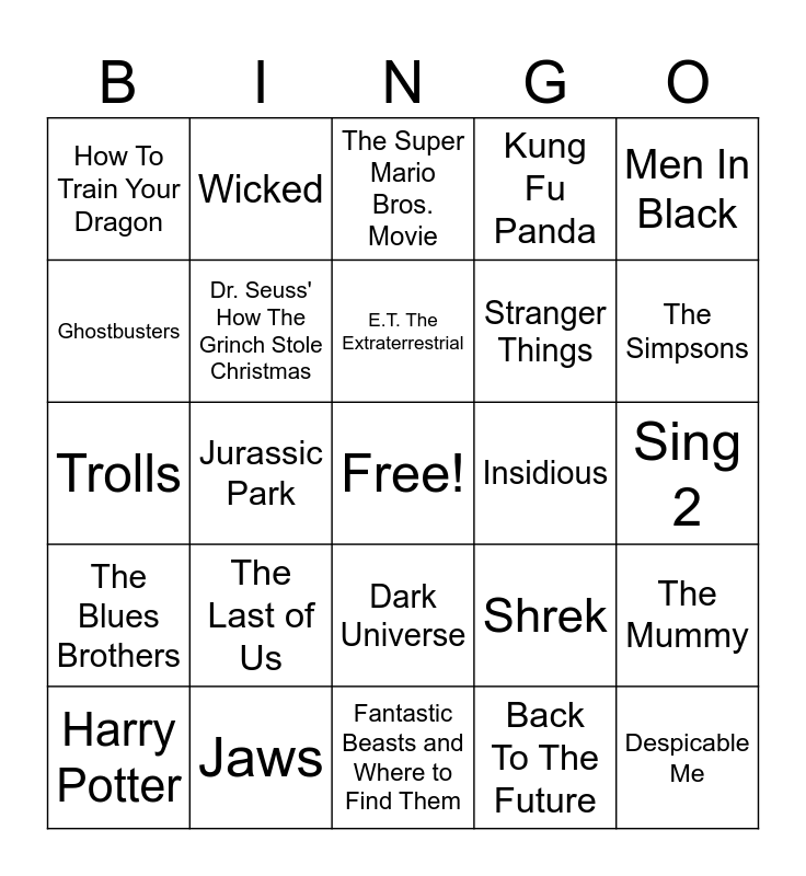 This bingo card has a free space and 24 words: The Last of Us, Jaws, E.T. The Extraterrestrial, Harry Potter, Men In Black, How To Train Your Dragon, Ghostbusters, Wicked, Insidious, Dark Universe, Stranger Things, Trolls, Shrek, The Mummy, Dr. Seuss' How The Grinch Stole Christmas, Back To The Future, Sing 2, The Super Mario Bros. Movie, The Simpsons, Jurassic Park, Despicable Me, The Blues Brothers, Kung Fu Panda and Fantastic Beasts and Where to Find Them.