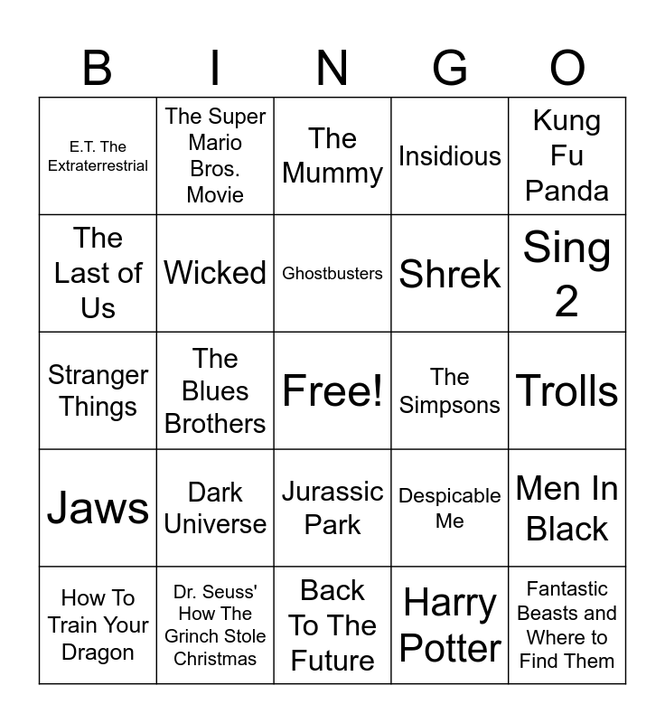 This bingo card has a free space and 24 words: Dark Universe, Dr. Seuss' How The Grinch Stole Christmas, Ghostbusters, How To Train Your Dragon, Kung Fu Panda, E.T. The Extraterrestrial, The Last of Us, The Super Mario Bros. Movie, The Simpsons, Jurassic Park, Shrek, Stranger Things, Despicable Me, Men In Black, Wicked, Harry Potter, Trolls, The Mummy, Sing 2, The Blues Brothers, Fantastic Beasts and Where to Find Them, Jaws, Insidious and Back To The Future.