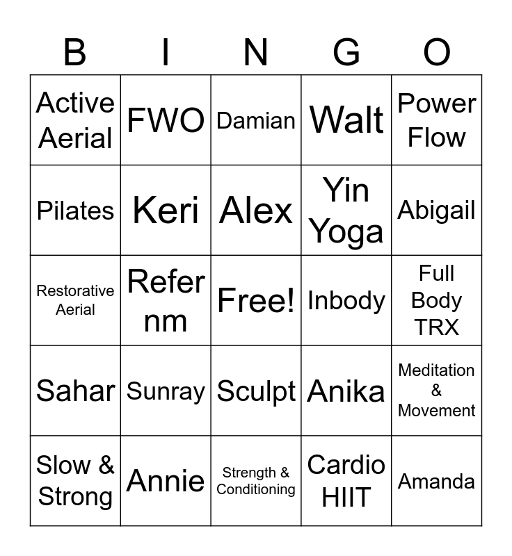 This bingo card has a free space and 24 words: Sunray, Annie, Alex, Slow & Strong, Power Flow, Active Aerial, Pilates, FWO, Inbody, Sculpt, Yin Yoga, Restorative Aerial, Anika, Meditation & Movement, Keri, Cardio HIIT, Full Body TRX, Damian, Abigail, Refer nm, Amanda, Sahar, Walt and Strength & Conditioning.