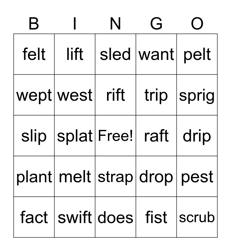 This bingo card has a free space and 24 words: melt, swift, rift, fact, pelt, felt, wept, lift, raft, strap, trip, slip, drop, pest, west, fist, drip, sled, sprig, splat, scrub, plant, want and does.