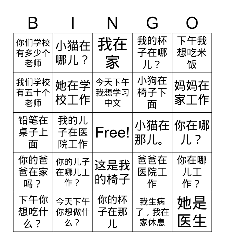 This bingo card has a free space and 24 words: 你的儿子在哪儿工作?, 今天下午你想做什么?, 今天下午我想学习中文, 下午你想吃什么?, 下午我想吃米饭, 你们学校有多少个老师, 我们学校有五十个老师, 小猫在哪儿?, 小猫在那儿。, 这是我的椅子, 小狗在椅子下面, 铅笔在桌子上面, 爸爸在医院工作, 你在哪儿工作?, 她在学校工作, 我生病了,我在家休息, 你在哪儿?, 我在家, 妈妈在家工作, 我的儿子在医院工作, 她是医生, 你的爸爸在家吗?, 我的杯子在哪儿? and 你的杯子在那儿.