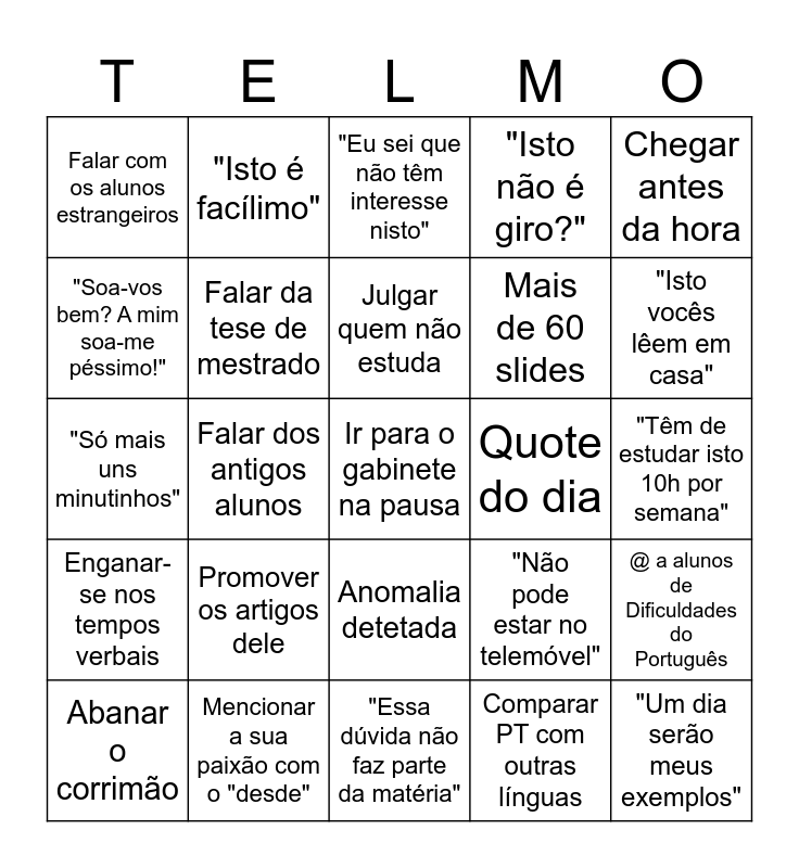 This bingo card has a free space and 24 words: Promover os artigos dele, Mencionar a sua paixão com o "desde", Julgar quem não estuda, Abanar o corrimão, Chegar antes da hora, Falar com os alunos estrangeiros, "Soa-vos bem? A mim soa-me péssimo!", "Isto é facílimo", Quote do dia, Anomalia detetada, Mais de 60 slides, "Só mais uns minutinhos", "Não pode estar no telemóvel", @ a alunos de Dificuldades do Português, Falar da tese de mestrado, Comparar PT com outras línguas, "Têm de estudar isto 10h por semana", "Eu sei que não têm interesse nisto", "Isto vocês lêem em casa", Falar dos antigos alunos, "Um dia serão meus exemplos", Enganar-se nos tempos verbais, "Isto não é giro?" and "Essa dúvida não faz parte da matéria".