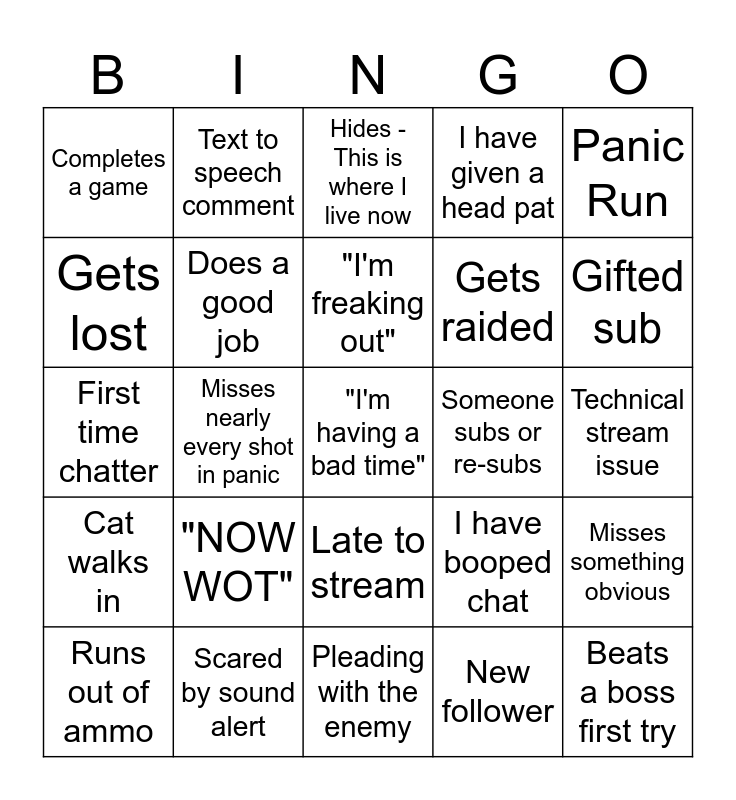 This bingo card has a free space and 24 words: "NOW WOT", Scared by sound alert, "I'm freaking out", Runs out of ammo, Panic Run, Completes a game, Gets lost, Text to speech comment, Someone subs or re-subs, Late to stream, Gets raided, First time chatter, I have booped chat, Misses something obvious, Does a good job, New follower, Technical stream issue, Hides - This is where I live now, Gifted sub, Misses nearly every shot in panic, Beats a boss first try, Cat walks in, I have given a head pat and Pleading with the enemy.