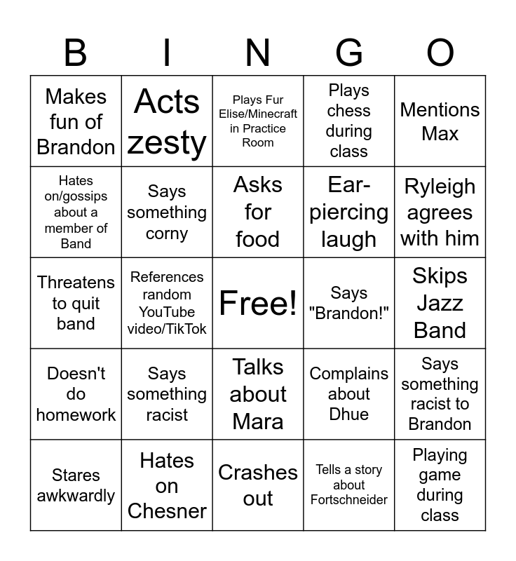 This bingo card has a free space and 24 words: Says something racist, Hates on Chesner, Asks for food, Stares awkwardly, Mentions Max, Makes fun of Brandon, Hates on/gossips about a member of Band, Acts zesty, Says "Brandon!", Talks about Mara, Ear-piercing laugh, Threatens to quit band, Complains about Dhue, Says something racist to Brandon, Says something corny, Tells a story about Fortschneider, Skips Jazz Band, Plays Fur Elise/Minecraft in Practice Room, Ryleigh agrees with him, References random YouTube video/TikTok, Playing game during class, Doesn't do homework, Plays chess during class and Crashes out.