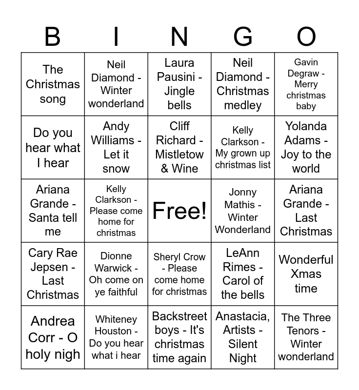 This bingo card has a free space and 100 words: Mariah Carey- All I want for christmas, Jose Feliciano - Little Drummer Boy, Ariana Grande - Last Christmas, Pentatonix - God rest ye merry gentleman, Andy Williams - It's the most wonderful time of the year, Celine Dion - Hallelujah, Dionne Warwick - Have yourself a merry little christmas, LeAnn Rimes - White Christmas, Amy Grant - Sleigh ride, Engelbert Humperdinck - Blue Christmas, Laura Pausini - Jingle Bell Rock, Johnny Cash - I heard the bells on Christmas day, Jessica Simpson - I saw mommy kissing santa claus, Whiteney Houston - Do you hear what i hear, Michael Buble' - Silver Bells, Mary's boy child, Kelly Clarkson - My grown up christmas list, Lady Antebellum - Holly jolly christmas, Train - Shake up christmas, Andrea Bocelli - Angels we have heard on high, Divo - O holy night, Andy Williams - The bells of St. Marys, Marc Anthony - Feliz Navidad, Justin Bieber - Santa Claus is coming to town, Pentatonix - Mistletoe, Jonny Mathis - Winter Wonderland, Gavin Degraw - Merry christmas baby, LeAnn Rimes - Carol of the bells, Boyz II Men - Let it snow, Manhattan Transfer - Happy holiday, Kelly Clarkson - Please come home for christmas, The Christmas song, Justin Bieber - Mistletoe, Michael Buble' & Celine Dion - So this is christmas, Anastacia, Artists - Silent Night, Cliff Richard - Mistletow & Wine, Wonderful Xmas time, Pentatonix & Kelly Clarkson - I'll be home for christmas, Jonny Cash, June Carter - Christmas time's a comin', Jost Groban - It came upon a midnight clear, Christina Aguilera - Have yourself a merry little christmas, LeAnn Rimes - Holly jolly christmas, Ariana Grande - Santa tell me, Darlene Love - All alone on christmas, Yolanda Adams - Joy to the world, Laura Pausini - Jingle bells, Miley Cyrus - Rockin around the christmas tree, Kylie Minogue - At Christmas, Pentatonix - Hark the herald angels sing, Backstreet boys - It's christmas time again, Garth Brooks, Trisha Yearwood - Marshmallow world, Marc Anthony - Christmas Auld lang syne, Loretta Lynn, Jennifer Nettles - Country christmas, Jonny Cash & Roy Clark - Here comes Santa Claus, The Three Degrees - Last christmas, Leona Lewis - One more step, Coldplay - Christmas lights, Jonny Cash, June, Hellen - Children go where I send thee, Sara Bareilles & Ingrid Michaelson - Winter song, Neil Diamond - Christmas medley, Jonny Logan, Helmut Lotti - Merry christmas everyone, Jose Feliciano - Silent night, Tori Kelly - Hallelujah, Martina McBride - O holy night, LeAnn Rimes - Rockin around the christmas tree, Garth Brooks & Trisha Yearwood - Feliz Navidad, Pentatonix - Little drummy boy, Petula Clark - Winter wonderland, Sara Evans - Silent night, BJ Thomas - I'll be home for christmas, Jonny Logan - Happy christmas, Dionne Warwick - Oh come on ye faithful, Pentatonix - Merry Christmas, happy holidays, Latie Melua & the Women's Choir - The little swallow, Engelbert Humperdinck - The christmas song, Daryl Hall and & John Oates - Jingle bell rock, Jamie Cullum - Let it snow, Do you hear what I hear, Annie Lennox - Angels we have heard on high, Earth Wind and Fire - Winter wonderland, Gavin Degraw - Have yourself a merry little christmas, The Three Tenors - Winter wonderland, Michael Bolton - White christmas, Sheryl Crow - Please come home for christmas, Pentatonix - Santa claus is coming to town, Neil Diamond - Winter wonderland, Diana Ross - It's the most wonderful time of the year, Sleigh Ride, Steve Wonder - The christmas song, Cary Rae Jepsen - Last Christmas, Michael Buble & Tori Kelly - Jingle Bells, The pointer sisters - Santa Claus is coming to town, Miley Cyrus - All I want for christmas, Andrea Corr - O holy nigh, Andy Williams - Let it snow, Vicky Leandros - The little drummer boy, Mary J Blige - Rudolph the red nosed reineer, Michael Buble & Cary Rae Jepsen - Rockin around the christmas tree, John Legend - What christmas means to me and Dolly Parton - I saw mommy kissing santa claus.