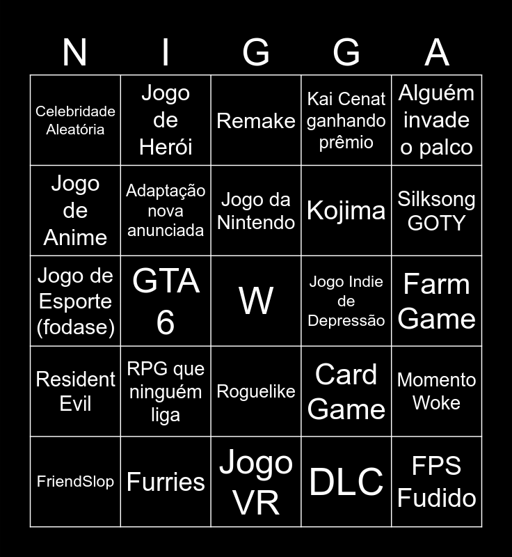 This bingo card has a free space and 24 words: FriendSlop, RPG que ninguém liga, Jogo da Nintendo, DLC, Alguém invade o palco, Celebridade Aleatória, Jogo de Herói, Remake, Jogo Indie de Depressão, Farm Game, Jogo de Esporte (fodase), Adaptação nova anunciada, Card Game, Momento Woke, Jogo de Anime, Furries, Jogo VR, Kai Cenat ganhando prêmio, Silksong GOTY, Resident Evil, GTA 6, Roguelike, Kojima and FPS Fudido.