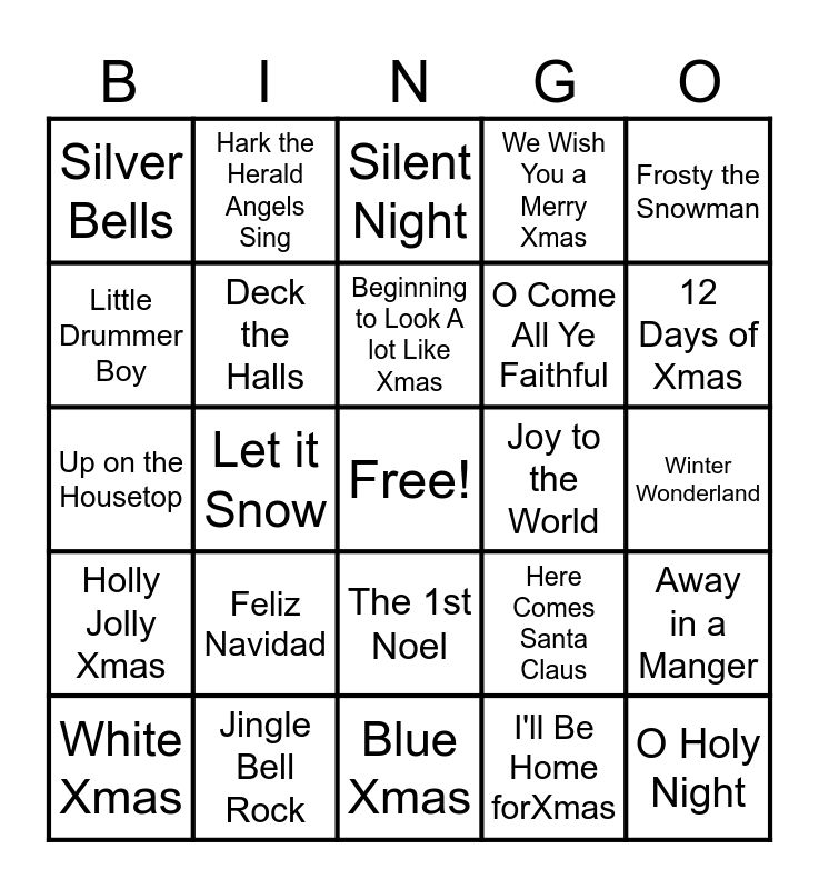 This bingo card has a free space and 29 words: White Xmas, Jingle Bells, Let it Snow, Rudolph, Silver Bells, Silent Night, Deck the Halls, Feliz Navidad, Joy to the World, Jingle Bell Rock, Winter Wonderland, O Holy Night, Blue Xmas, I'll Be Home forXmas, 12 Days of Xmas, Home for the Holidays, The 1st Noel, Holly Jolly Xmas, Frosty the Snowman, Up on the Housetop, Here Comes Santa Claus, Baby, it's Cold Outside, O Come All Ye Faithful, Little Drummer Boy, We Wish You a Merry Xmas, Hark the Herald Angels Sing, Away in a Manger, Beginning to Look A lot Like Xmas and Sleigh Ride.