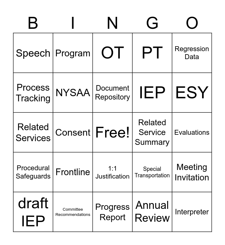 This bingo card has a free space and 24 words: draft IEP, Frontline, Document Repository, Annual Review, Regression Data, Speech, Program, OT, Related Service Summary, Evaluations, Related Services, NYSAA, Special Transportation, Meeting Invitation, Process Tracking, Committee Recommendations, Progress Report, PT, ESY, Procedural Safeguards, Consent, 1:1 Justification, IEP and Interpreter.