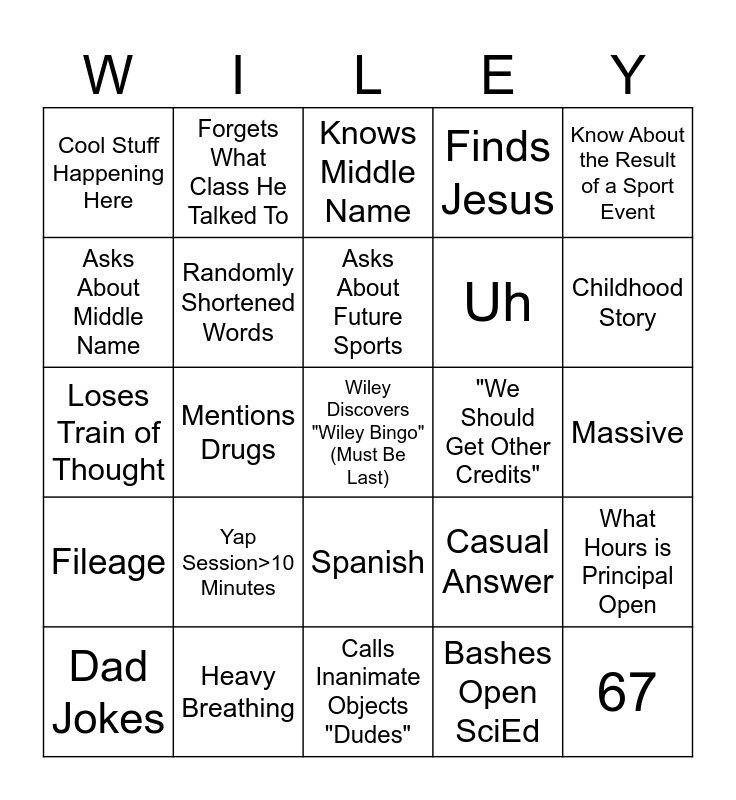 This bingo card has a free space and 37 words: Perf, What the Davey, Intro>30 Minutes, Randomly Shortened Words, What Hours is Principal Open, Yap Session>10 Minutes, Asks About Future Sports, Asking Result of Sport Event, Know About the Result of a Sport Event, Random Question, Mentions Drugs, Finds Jesus, 67, Massive, Asks About Middle Name, Fileage, Foldable, Knows Middle Name, Spanish, "We Should Get Other Credits", Cool Stuff Happening Here, Childhood Story, Dad Jokes, Calls Inanimate Objects "Dudes", "Hmm", Bashes Open SciEd, Forgets What Class He Talked To, ___ City, Talks About Famous Scientists, Doesn't Remember Slide Contents, Big Time, Heavy Breathing, Loses Train of Thought, Laughs at a Weird Time, Casual Answer, Uh and Calls Jesus "Middle Eastern Man".