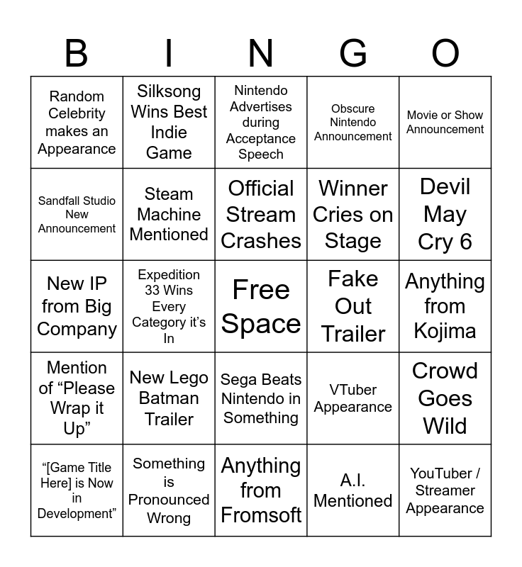 This bingo card has a free space and 54 words: Mobile Game Ad, Mention of “Please Wrap it Up”, GTA6 Wins Best Upcoming Game, FF7 Remake Part 3, Sega Beats Nintendo in Something, Dead Franchise Revival, Obscure Nintendo Announcement, Trailer for a Game Already Announced with No New Additions, Sandfall Studio New Announcement, Last Reveal of the Night Sucks, Random Celebrity makes an Appearance, New Hazelight Announcement, Something is Pronounced Wrong, “[Game Title Here] is Now in Development”, Jumpscare in Trailer, Anything from Fromsoft, YouTuber / Streamer Appearance, Winner Cries on Stage, Old Game Remake, Anything from Kojima, VTuber Appearance, Expedition 33 Wins GOTY, Fake Out Trailer, Movie or Show Announcement, Close-Up Shot of the Flute Guy, Silksong Wins Best Indie Game, “Available Now”, Obligatory Muppet Cameo, Unfunny Joke, A.I. Mentioned, Acceptance Speech Includes Roast, Monster Hunter Wilds DLC, Any New Xbox Announcement, Bethesda Announcement, Nintendo Advertises during Acceptance Speech, Trailer with No Release Date, New IP from Big Company, Crowd Goes Wild, Site to Use Promo Code is Down / Doesn’t Work, Steam Machine Mentioned, 2XKO Release Date, Fighting Game DLC Character Announcement, Sonic CrossWorlds Season Pass 2, Horizon Forbidden West Sequel, New Lego Batman Trailer, Kingdom Hearts 4, Dispatch Wins Something, Charlie Cox Wins Best Performance, Official Stream Crashes, Expedition 33 Wins Every Category it’s In, Devil May Cry 6, Persona 6, Cozy Farming Game and Minecraft Movie Wins Best Adaptation.