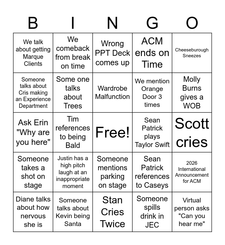 This bingo card has a free space and 29 words: Diane talks about how nervous she is, Ask O'Brian about his shirt, Tim references to being Bald, Someone else talks about Tim being bald, We talk about getting Marque Clients, Wrong PPT Deck comes up, Some one talks about Trees, Justin has a high pitch laugh at an inappropriate moment, Sean Patrick plays Taylor Swift, Someone talks about Kevin being Santa, Scott cries, Virtual person asks "Can you hear me", Stan Cries Twice, Someone spills drink in JEC, Molly Burns gives a WOB, Sean Patrick references a past show, Someone mentions parking on stage, Someone takes a shot on stage, Cheeseburough Sneezes, Ask Erin "Why are you here", Sean Patrick references to Caseys, Someone refers to Mike Walshs hair, We mention Orange Door 3 times, Someone talks about Cris making an Experience Department, ACM ends on Time, We comeback from break on time, 2026 International Announcement for ACM, Wardrobe Malfunction and You have 2+Drinks.
