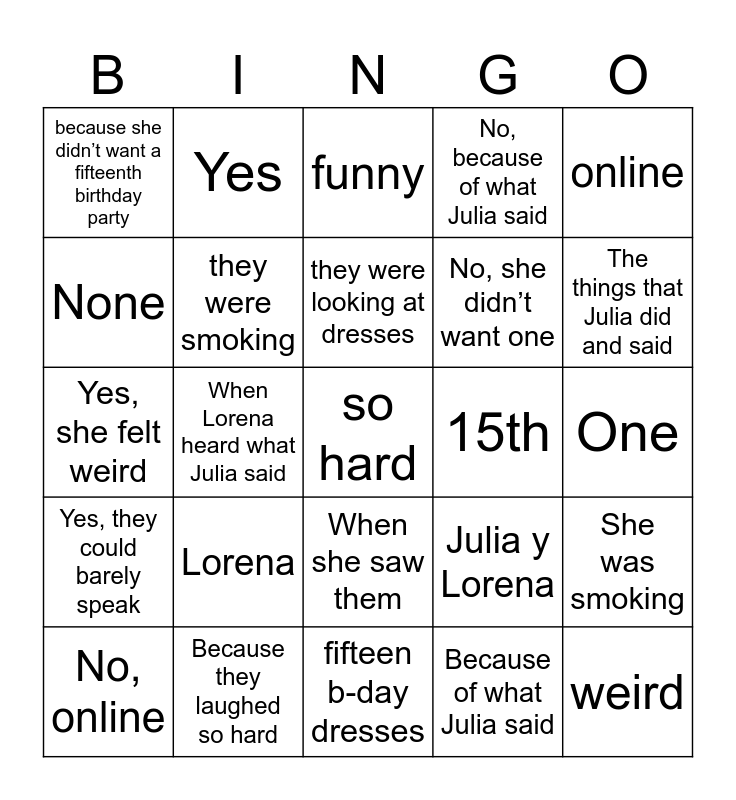 This bingo card has 25 words: Lorena, fifteen b-day dresses, they were looking at dresses, No, online, online, because she didn’t want a fifteenth birthday party, None, Yes, 15th, When she saw them, No, she didn’t want one, Yes, she felt weird, Julia y Lorena, She was smoking, they were smoking, weird, One, funny, The things that Julia did and said, When Lorena heard what Julia said, so hard, Because they laughed so hard, Yes, they could barely speak, No, because of what Julia said and Because of what Julia said.
