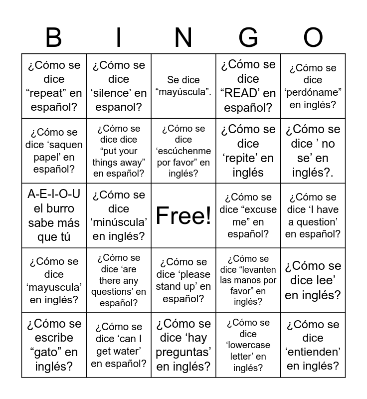 This bingo card has a free space and 49 words: ¿Cómo se dice ‘comprendan’ en inglés?, ¿Cómo se dice ‘entienden’ en inglés?, ¿Cómo se dice ‘do you all understand’ en español?, ¿Cómo se dice ‘hay preguntas’ en inglés?, ¿Cómo se dice ‘are there any questions’ en español?, ¿Cómo se dice ”silencio” en inglés., ¿Cómo se dice ‘silence’ en espanol?, ¿Cómo se dice “take out paper” en español?, ¿Cómo se dice ‘saquen papel’ en español?, ¿Cómo se dice “guarden sus cosas” en inglés?, ¿Cómo se dice dice “put your things away” en español?, ¿Cómo se dice “READ’ en español?, ¿Cómo se dice lee’ en inglés?, ¿Cómo se dice “levanten las manos por favor” en inglés?, ¿Cómo se dice ‘please raise your hands” en español?, ¿Cómo se dice “listen to me please” en español?, ¿Cómo se dice ‘escúchenme por favor” en inglés?, ¿Cómo se dice “excuse me” en español?, ¿Cómo se dice ‘disculpe’ en inglés?, ¿Cómo se dice ‘perdóname” en inglés?, ¿Cómo se dice ‘minúscula’ en inglés?, ¿Cómo se dice ‘lowercase letter’ en inglés?, ¿Cómo se dice “repeat” en español?, ¿Cómo se dice ‘repite’ en inglés, ¿Cómo se dice “I don’t know” en español?, ¿Cómo se dice ’ no se’ en inglés?., ¿Cómo se escribe “gato” en inglés?, ¿Cómo se dice “levántense por favor” en inglés?, ¿Cómo se dice ‘please stand up’ en español?, ¿Cómo se dice ‘mayuscula’ en inglés?, ¿Cómo se dice ‘capital letter’ en español?, ¿Cómo se dice ”sientense por favor” en inglés?, ¿Cómo se dice “sit down please” en español?, ¿Cómo se dice ‘puedo beber agua’ en ingles, ¿Cómo se dice ‘can I get water’ en español?, ¿Cómo se dice ‘puedo ir al baño’ en inglés?, ¿Cómo se dice ‘can I go to the bathroom’ en español?, ¿Cómo se dice ‘tengo una pregunta’ en inglés?, ¿Cómo se dice ‘I have a question’ en español?, ¿Cómo se dice ‘abran sus libros’ en inglés?, ¿Cómo se dice ‘open your books’ en español?, ¿Cómo se dice ‘cierren sus libros’ en inglés?, ¿Cómo se dice ‘close your books’ en español?, What is the rhyme to help you remember the Spanish vowels?, A-E-I-O-U el burro sabe más que tú, Se dice “mayúscula”., Se dice “upper case letter”., Se dice “no entiendo”. and Se dice “no comprendo”..