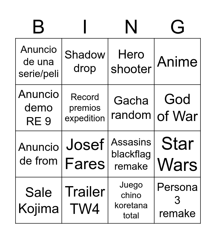 This bingo card has 16 words: Trailer TW4, Star Wars, Hero shooter, Anuncio de una serie/peli, Anuncio de from, Shadow drop, Assasins blackflag remake, Juego chino koretana total, Anuncio demo RE 9, Record premios expedition, Sale Kojima, Anime, Josef Fares, God of War, Gacha random and Persona 3 remake.