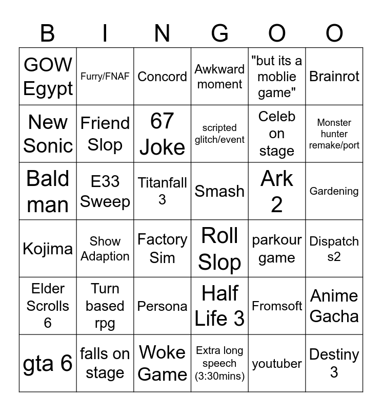 This bingo card has 36 words: Half Life 3, Persona, Extra long speech (3:30mins), New Sonic, Kojima, Smash, Friend Slop, Woke Game, "but its a moblie game", Fromsoft, Monster hunter remake/port, Awkward moment, Anime Gacha, E33 Sweep, scripted glitch/event, GOW Egypt, Elder Scrolls 6, Ark 2, Bald man, Concord, Titanfall 3, Show Adaption, Roll Slop, Factory Sim, parkour game, Furry/FNAF, Celeb on stage, falls on stage, 67 Joke, Brainrot, Destiny 3, gta 6, Dispatch s2, Gardening, Turn based rpg and youtuber.