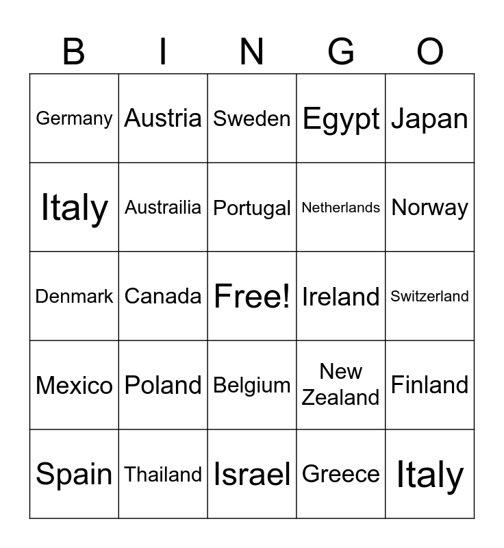 This bingo card has a free space and 24 words: Poland, Thailand, Portugal, Spain, Japan, Germany, Italy, Austria, Ireland, Belgium, Netherlands, Denmark, New Zealand, Finland, Austrailia, Greece, Switzerland, Sweden, Norway, Canada, Italy, Mexico, Egypt and Israel.
