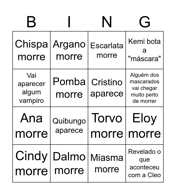 This bingo card has 16 words: Dalmo morre, Eloy morre, Escarlata morre, Chispa morre, Ana morre, Argano morre, Torvo morre, Miasma morre, Vai aparecer algum vampiro, Pomba morre, Cindy morre, Kemi bota a "máscara", Quibungo aparece, Alguém dos mascarados vai chegar muito perto de morrer, Cristino aparece and Revelado o que aconteceu com a Cleo.
